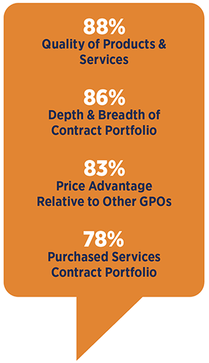 In the 2025 survey, 88% agreed that HealthTrust’s contracting philosophy, focused on member commitment and contract portfolio compliance, enhances overall value. HealthTrust members were also asked to rate their level of satisfaction in certain areas. The following showcases the percentage of those who responded “Extremely Satisfied” or “Satisfied.”